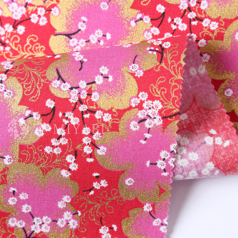 華やかな和の美を感じさせる、伝統的な桜模様の和柄生地です。艶やかな赤地に、大ぶりのピンクと金のグラデーションで描かれた桜の花が印象的にあしらわれています。小さな白い花や繊細な枝の描写が、春の息吹を感じさせる優雅なデザインです。背景に施された金色の葉模様が上品なアクセントとなり、全体に高級感を与えています。