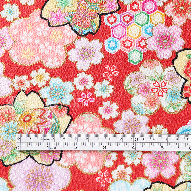 華やかな赤地に、可憐な桜の花々が咲き誇る春の情景を映した和柄デザイン。