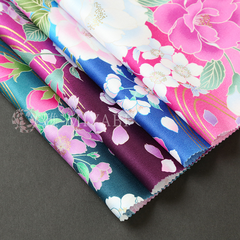 流れる水の上を綺麗に咲き誇る花々と、これから咲くだろう蕾が見事に融合されたイメージでとても華やかなデザインになっています。40サテンの生地がデザインをより上品に引き立てます。